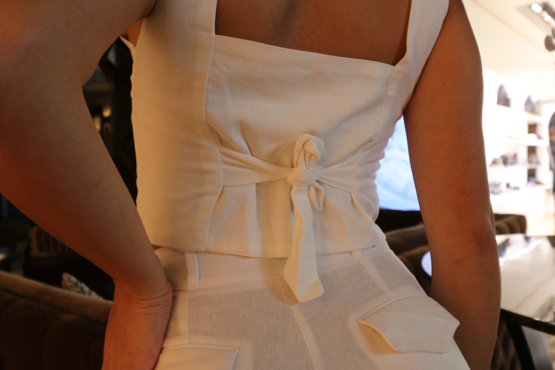 Chaleco confeccionado en lino olán con botones nacarados y abertura en la parte superior de la espalda, con tiras ajustadoras.