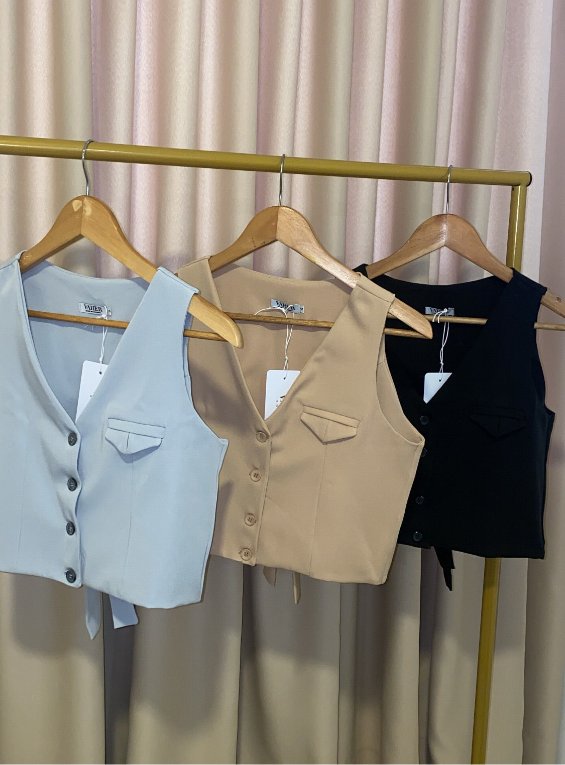 Chaleco en tela rígida con un detalle de bolsillo divino, y con tiras ajustadoras en la espalda.