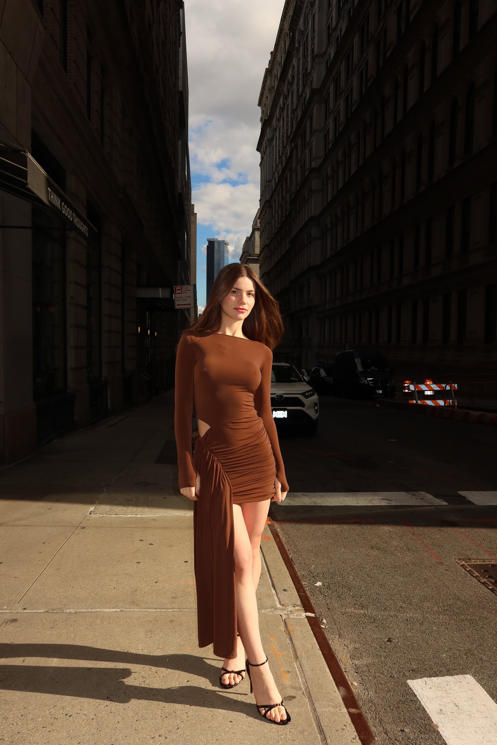 Vestido mini elaborado en tela licrada de manga larga con silueta ajustada y abertura en el dedo. La falda mini tiene un cut-out lateral con drapeado que cae en un largo asimétrico. Una pieza moderna y audaz con un movimiento elegante.