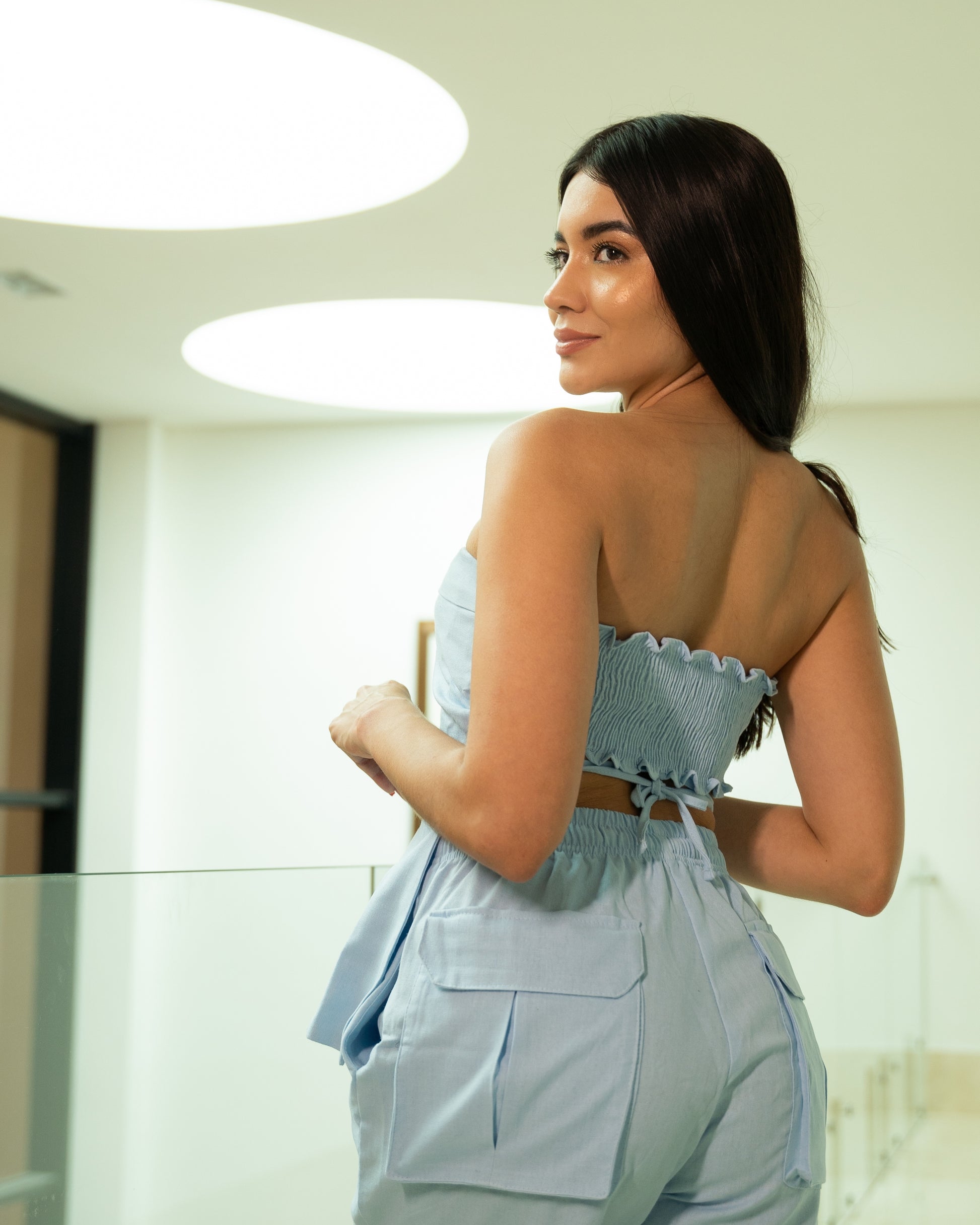 Top strapless, elaborado en Lino Olán. Es largo adelante, encauchado y corto atrás. Para los amantes de lo minimal y el lino.