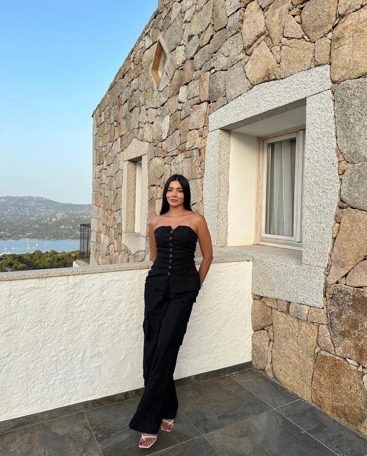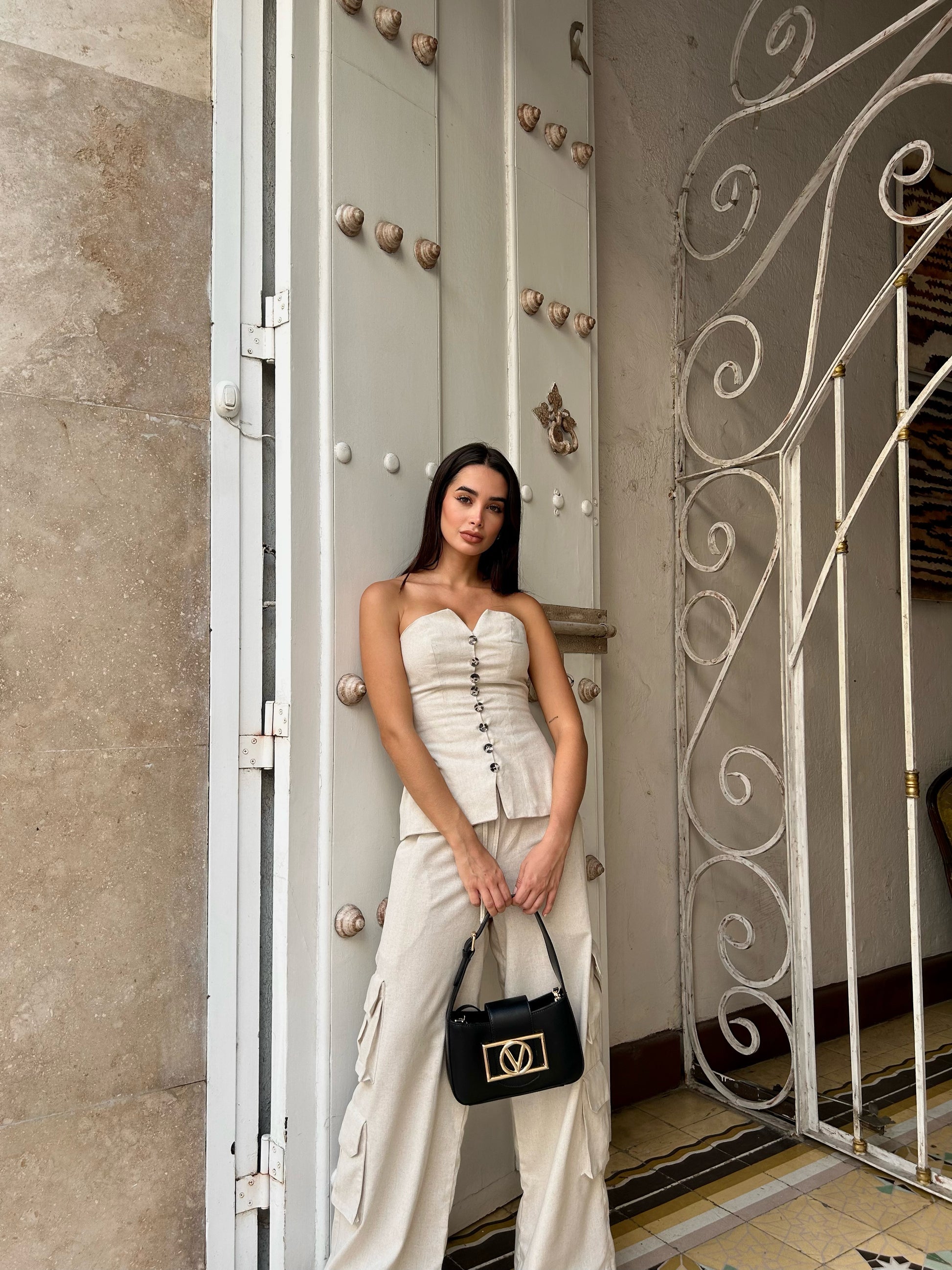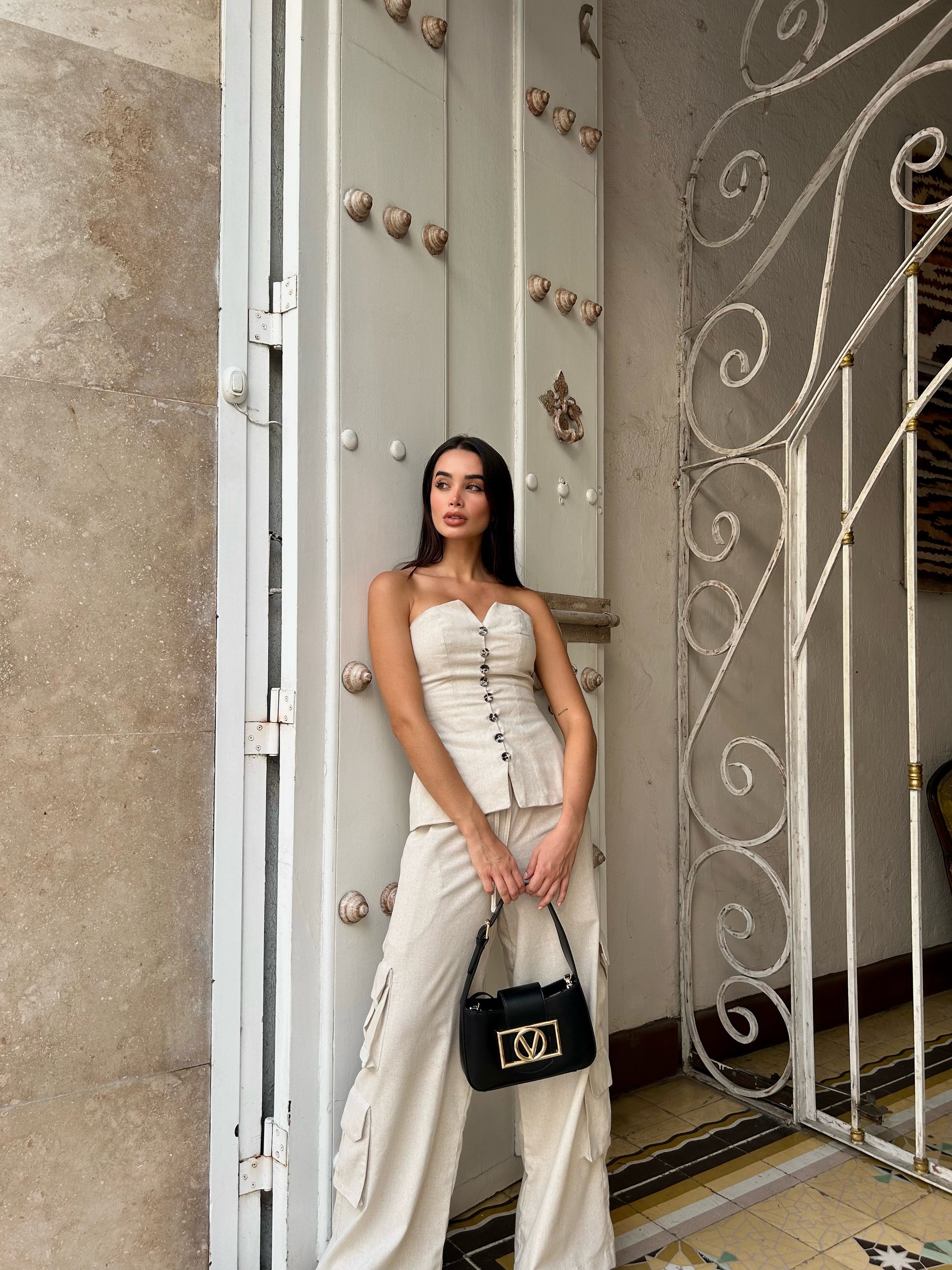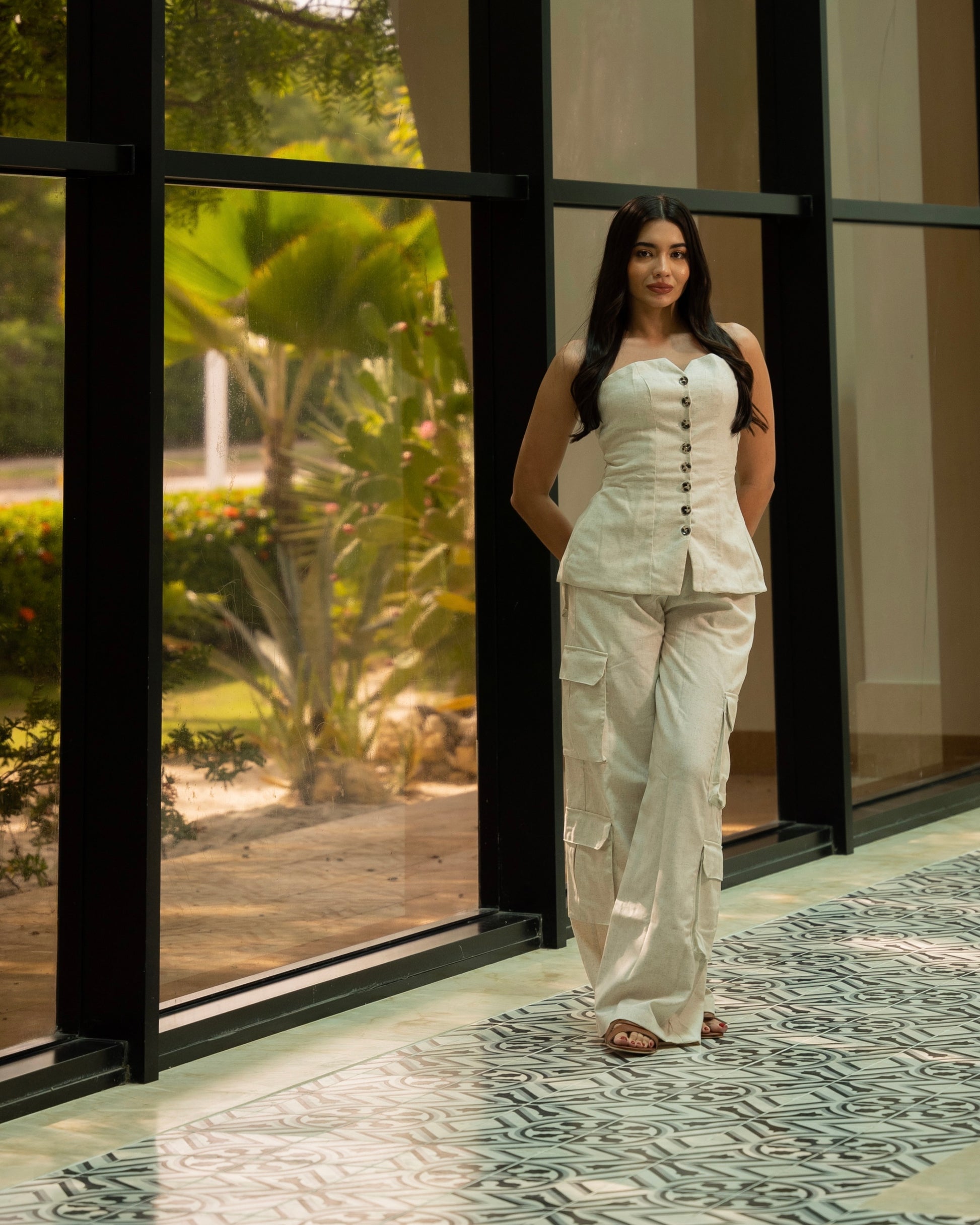 Un set que incluye el bustier Positano de botones nacarados y un pantalón cargo con cuatro bolsillos a los lados y dos atrás. El pantalón se puede ajustar en la cadera. Perfecto para los días donde te quieres ver elegante pero cómoda.