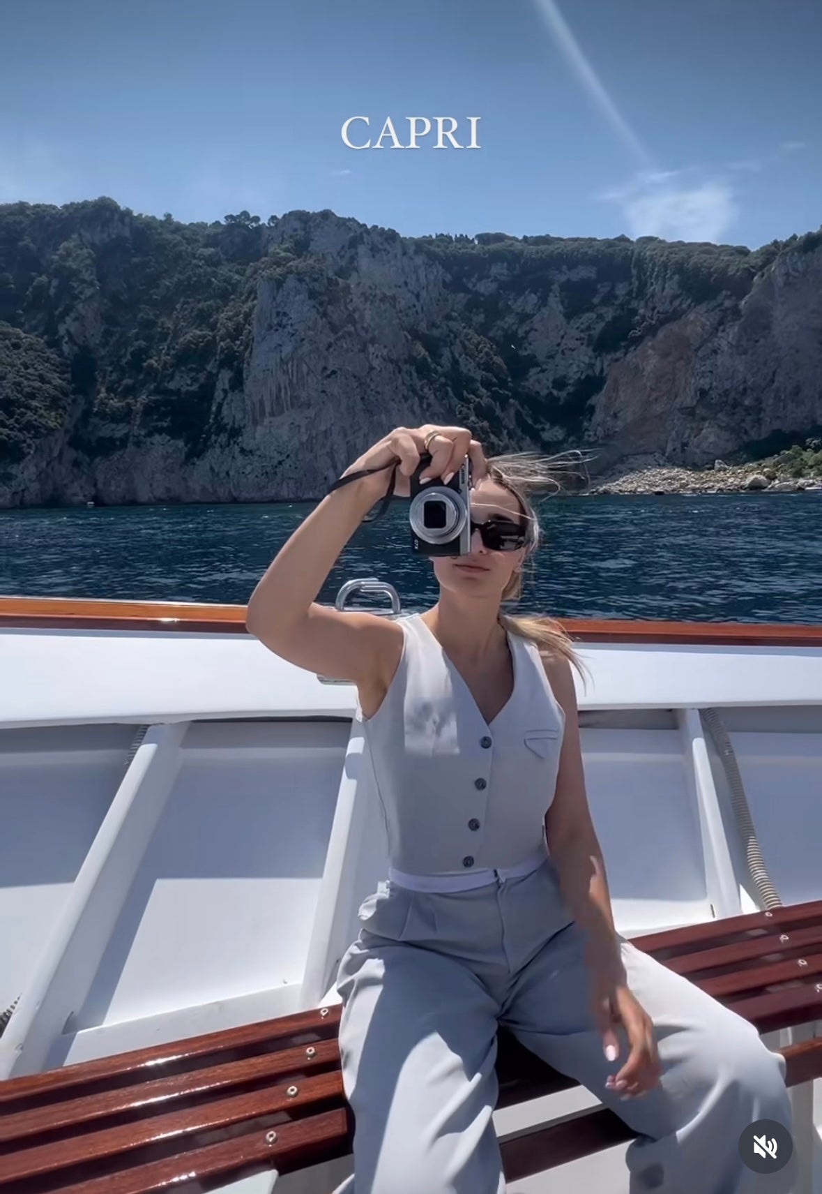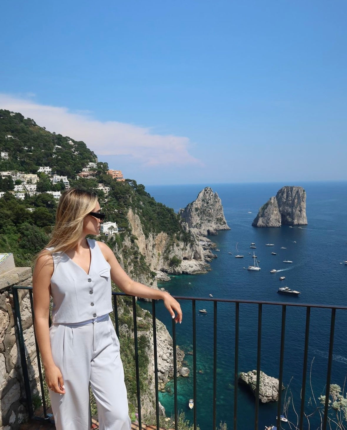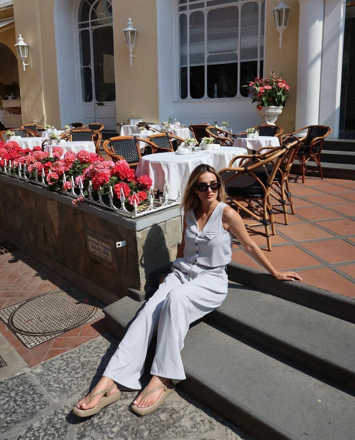 Set tipo sastre de chaleco y pantalón gris con pretina blanca. Amarás su tela! La modelo está usando la talla M.